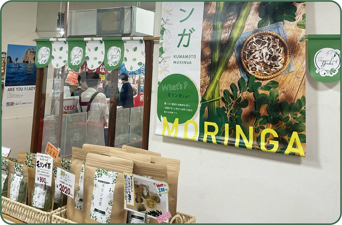 地域イベントやマルシェ、デパートでの催事などに積極的に出店し、熊本県産モリンガの魅力を広めています。モリンガ茶の試飲やモリンガ食レシピの試食も行っており、モリンガの手軽な楽しみ方をご紹介しています。